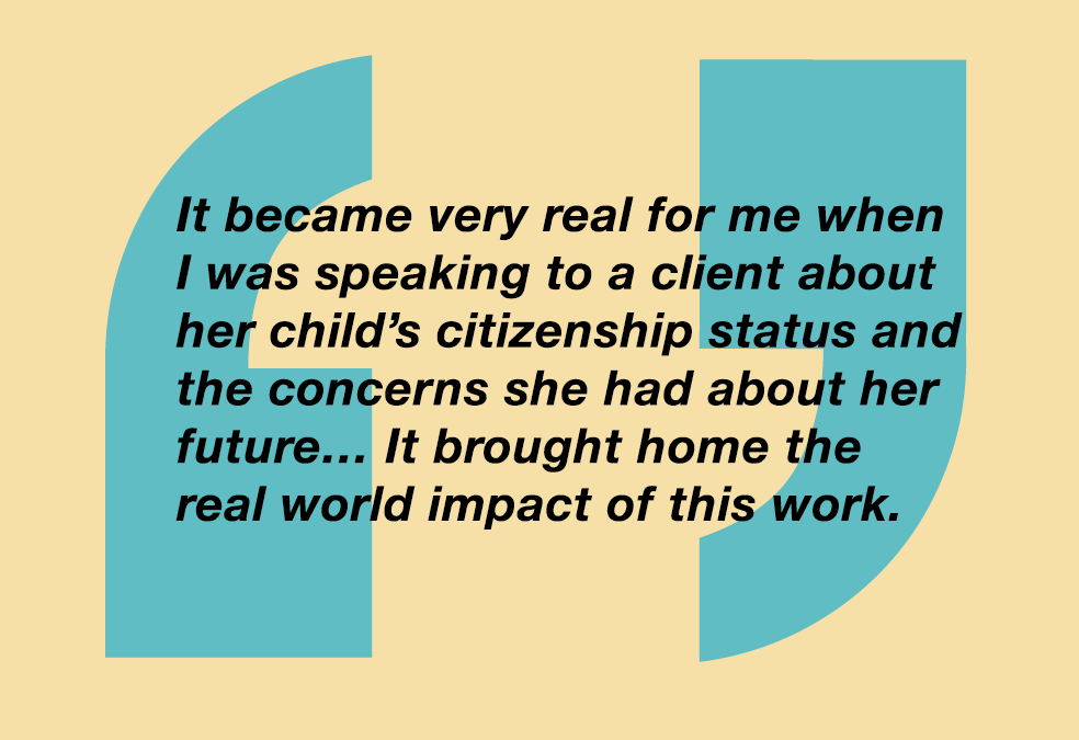 It became very real for me when I was speaking to a client about her child’s citizenship status and the concerns she had about her future. I could hear the baby playing and talking in the background, who obviously had no idea about the seriousness of the situation. It brought home the real world impact of this work – and just how important taking on KIND cases is for the families they work with.